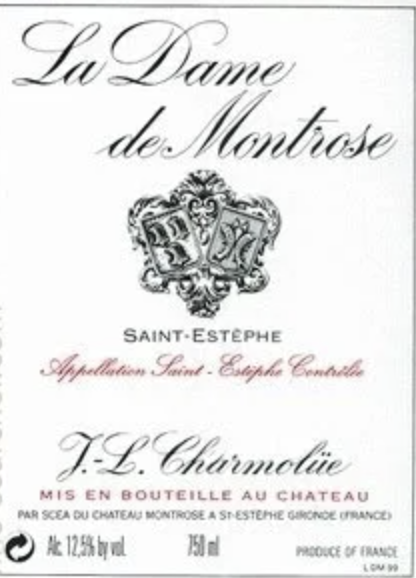 The 2015 La Dame de Montrose, the elegant second wine of Château Montrose, offers a compelling expression of Saint-Estèphe with both pedigree and approachability. The estate itself dates back to 1815, when it was founded by Étienne Théodore Dumoulin on gravelly rises overlooking the Gironde estuary—an ideal terroir that would eventually earn Montrose its classification as a Second Growth in the 1855 Bordeaux Classification. Over the decades, Château Montrose has built a reputation for producing structured, long-lived wines, and in more recent years, under the ownership of the Bouygues family, the estate has embraced a meticulous, sustainability-driven approach to viticulture and winemaking. The current technical team, led by experienced estate director Hervé Berland (formerly of Château Mouton Rothschild), focuses on precision and balance, ensuring that even the second wine reflects the estate’s grand vin philosophy. La Dame de Montrose is crafted primarily from Cabernet Sauvignon and Merlot, with smaller portions of Cabernet Franc and Petit Verdot, depending on the vintage. The 2015 vintage—widely regarded as exceptional across Bordeaux—allowed for optimal ripeness and concentration, resulting in a wine that is both plush and structured. Compared to the grand vin, La Dame emphasizes earlier-drinking charm, showcasing ripe dark fruit, cassis, and plum layered with notes of graphite, cedar, and subtle spice. The tannins are refined yet present, offering enough backbone for mid-term aging while remaining accessible in its youth. This wine captures the essence of Saint-Estèphe’s power and depth, while delivering a polished, approachable style that makes it an excellent introduction to one of Bordeaux’s most respected estates.